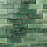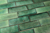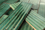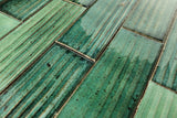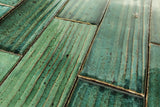 Colour Detail: Handmade rectangular tile with deep green glazes and linear relief for use on walls.