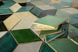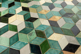 Colour Detail: Blend green, gray, aqua, and vitrified diamond-shaped tiles. All hand-made with marbled clay. Mostly gloss, with a few in matt finish.