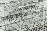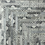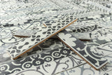Colour Detail: Hand made rectangular tile, with tones of grey to black in deconstructed classic pattern geometric and floral on a satin matt glaze.