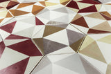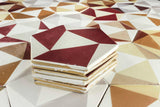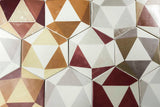Colour Detail: Matt white glaze with geometric pattern in warm earth tones. Large hexagon hand made tile with raised sides, making them ideal for use on feature wall.
