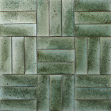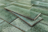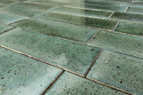Colour Detail: Hand made coarse terracotta tile, glaze which breaks across the surface into tones of aqua green with iron speckle for use on wall or floor