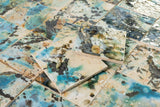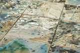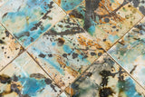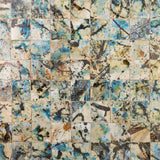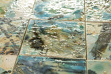 Each unit carries a unique painted composition, built through layered gestures, splashes, washes, and kiln-driven reactions. Blues, mineral greens, ochres, charcoals, and stone tones interweave across the surface, creating a field that reads as atmospheric at distance and richly legible at proximity.