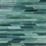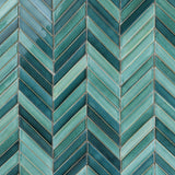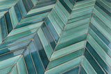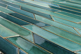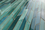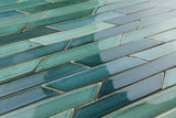 Colour Detail: Handmade rectangular tile with alternating cut diagonal ends, in aqua, green and blue green glazes for use on wall or floor
